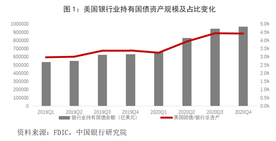 第一,银行持有国债意愿显著降低,弱化国债市场做市能力。过去一段时期,在SLR豁免政策下,美国银行业持有国债规模大幅上升。截至2020年年末,美国银行业持有国债规模达9668.8亿美元,占同期美国银行业总资产的4.4%,分别较豁免政策实施前(2020年第一季度末)增加了46.9%和1.2个百分点(图1)。特别是在美债收益率上行的背景下,美国银行业成为除美联储以外少有的美债份额增持主体。SLR豁免政策到期,将显著降低银行持有国债意愿,弱化银行在国债市场的做市能力,进而加剧国债价格下跌与收益率上行。截至2021年3月10日,美国10年期国债收益率攀升至1.53%,较年初上涨了60个基点,处于一年来的高位。过去半个月,5年期、7年期、30年期美国国债拍卖倍数分别降至2.02、1.86和1.86,处于历史低位。
