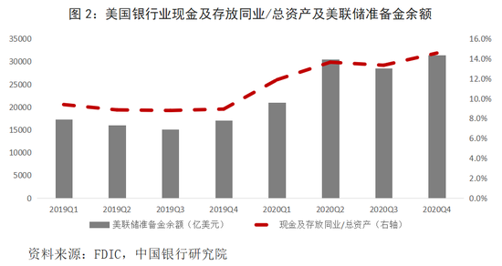 第四,存放美联储准备金趋降,倒逼银行资产结构调整。2020年四季度末,美联储准备金余额达到31350亿美元,美国银行业现金及存放同业/总资产比例为14.6%,分别较2020年一季度(SLR豁免政策推出前)增长49.3%和2.7个百分点。存放联储和国债配置比例的提高,客观上抑制了银行信贷、公司债等资产配置。SLR豁免政策到期,将显著增加银行存放美联储的资本成本,倒逼银行业重置资产结构。