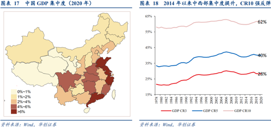 2014年以来中西部GDP集中度明显提升。若将各省视作同一行业中的各家公司,2008年前GDP CR3、CR5升幅高于CR10,主要是沿海的广东、江苏、山东、江苏4省受益于以“外循环”拉动为主的增长模式,2014年以来GDP CR10反弹更强,反映了GDP排名5-10位河南、四川、湖北、湖南等中西部省份的经济增速提升。