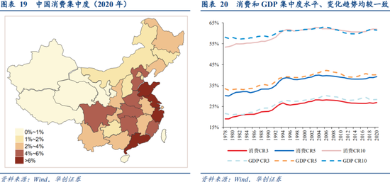 省际经济的分化,很大程度上是消费的分化。消费集中度的绝对水平和变动趋势与GDP集中度均较一致,2020年消费前5高地和GDP前5高地完全重合。