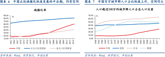 我国正处于城镇化快速发展的中后期,“十四五”期间城镇化率仍将提升近5个百分点。十四五规划纲要提出“完善新型城镇化战略,提升城镇化发展质量”,改革开放以来全国城镇人口由1.7亿人上升至8.5亿人,城镇人口比重(城镇化率)由17.9%提高到60.6%。从国际比较看:2017年,上中等收入国家平均城镇化率为65.45%,高收入国家平均城镇化率为81.53%,同期我国城镇化率为58.52%,比世界平均水平高3.7个百分点,但与处于相同发展阶段的上中等收入国家平均水平相比,低了近7个百分点,与高收入国家差距更大。2011年以来我国劳动人口总量占比转为下降、人口抚养比开始上升,人口红利消失,参考后人口红利国家城镇化率水平,我国城镇化率仍有一定上升空间。根据2021年政府工作报告,“十四五”时期常住人口城镇化率将升至65%。