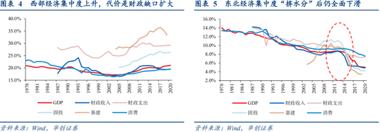 3.西部:基建次高,消费偏弱。7成土地,近2成消费、2成GDP、近3成人口、固投,3成基建仅次于东部。财政收入不到2成但支出近3成,缺口趋大。