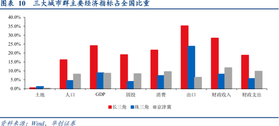 从城市化角度,比较城市群的集中度:十大城市群贡献全国GDP近8成;三大城市群凭借不到全国2%的土地面积,承载了近3成人口、4成GDP、近5成财政收入和近7成出口。