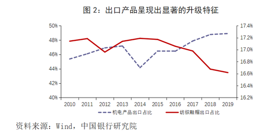 伴随着我国经济外循环发展,贸易结构也会出现转变。近年来,我国贸易结构持续改变,产业呈现出升级态势。一是服务贸易占比不断提升。截至2019年末,我国服务贸易进出口额占总进出口额的17.15%,近十年来平均增长0.34个百分点。二是中高端出口商品不断增多。以纺织鞋帽为代表的劳动密集型产业在中国出口占比中不断下降,而以机械、电子电气为代表的资本密集型和以交通设备、医疗仪器为代表的技术密集型产品占总出口比重不断上升。截至2019年末,机电产品、高新技术产品等出口金额占比分别为37.5%和11.4%,同比分别增加了0.1和0.03个百分点。纺织品、鞋靴等出口占比为11.8%和5.9%,同比分别下降了0.04和0.02个百分点(图2)。未来随着我国出口产品竞争力不断增强,服务贸易不断发展,贸易金融需加快发展以匹配贸易结构的转变。
