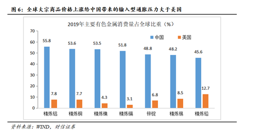 二是增加我国的输入型通胀压力,对货币政策形成牵制。无限量宽下的美元贬值,给美国自身带来输入型通胀压力的同时,也增加了我国的输入型通胀压力。因为美元贬值和贬值预期直接导致以美元计价的国际大宗商品价格上涨,加上我国是全球制造业中心和主要原材料进口国(见图6),输入型通胀压力对我国物价的影响远大于美国,对中国央行货币政策的制约效应也大于美联储,即面对通胀压力和通胀预期的上升,可能缩减央行货币政策空间,从而使货币政策的其他目标如就业、经济增长等目标受到一定影响,政策调控的完美度打上一定折扣。