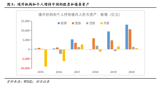 美国无限量宽政策削减美元信用,导致全球流动性一改2008年全球金融危机格局,外国投资者由增持美国国债变成减持。而我国疫情防控成效显著,央行资产负债表规模扩张幅度远小于美欧日央行,与疫情发生之前的2019年12月相比,2021年2月中日欧美央行资产负债规模分别增长3.2%、24.4%、51.5%、81.3%。加上经济基本面率先全球复苏,人民币计价资产在全球吸引力明显增强,尤其是债券和股票市场成为新的引力场,境外机构和个人全年新增规模均在1万亿元以上(见图5)。这无疑有助于加速人民币的国际化进程,如人民币国际支付在全球市场份额由2020年1月的1.65%提升至2021年2月的2.2%,人民币在全球外汇储备中的份额由2019年12月的1.94%提高到2020年9月的2.13%。展望未来,美联储无限量宽政策还会持续,从国家外汇储备资产安全的角度考虑,我国应继续抓住人民币国际化的“时间窗口期”,加速人民币国际化进程。