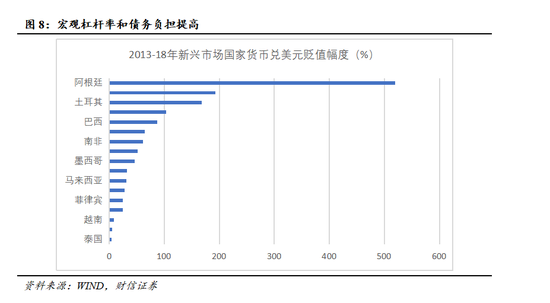 2013年5月美联储释放削减量化宽松规模信号,当年12月正式宣布把每月购债规模缩减100亿美元。量化宽松“退出”的负面影响通过资本流动、资产价格、货币汇率等多个渠道传导至世界各国,尤其是新兴经济体受到的冲击更为明显。如2013-18年美联储退出量宽期间,一些新兴市场国家货币兑美元汇率均出现不同程度贬值,阿根廷货币比索兑美元汇率贬值幅度超500%(见图8)。