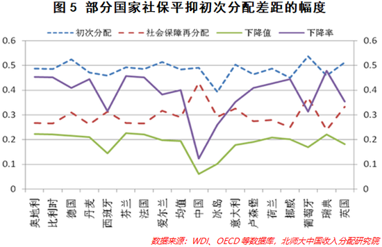 以社会保障为例,在北师大收入分配研究院2017年针对收入再分配制度的研究中,18个欧盟国家市场收入的基尼系数为0.443,在社会保障的作用下,这些国家的可支配收入基尼系数降为0.29。从下降幅度来看,欧盟国家政府的社会保障政策使得其基尼系数的平均值下降了40%,相比之下,中国仅下降了12.3%。