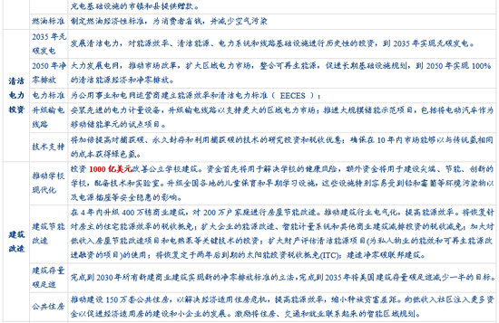 1)发展清洁电力,到2035年实现无碳发电。2)大力发展电网,推动市场改革,扩大区域电力市场。3)为公用事业和电网运营商建立能源效率和清洁电力标准( EECES );4)升级输电线路以支持更大的区域电力市场,推进大规模储能示范项目。5)将加倍提高对捕获碳、永久封存和利用捕获碳的技术的研究投资和税收优惠。