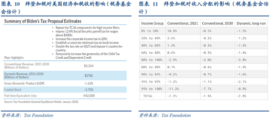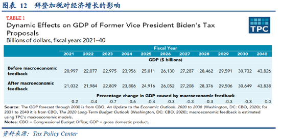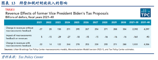 1)经济影响:使未来十年美国GDP总共下降3.4%,对GDP的影响将在2040年转正,在2040年以后的年份,正向影响将逐渐增大。2)收入影响:将使2021年至2030年的美国联邦收入减少1610亿美元(约占这10年总收入的8%),2031年至2040年减少900亿美元。到2040年,税收计划对联邦收入的影响将转正,其正效应在2040年的随后年份将逐渐增加。