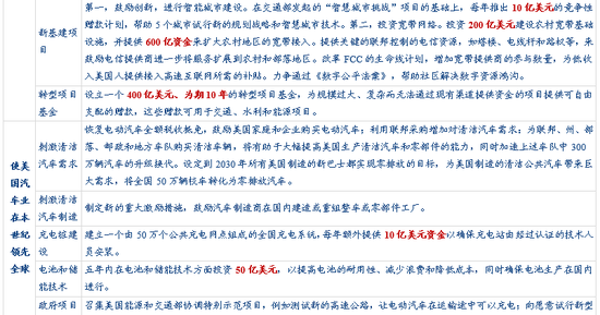 此外,值得说明的是,基建计划中各个领域的具体投资额尚不明晰,只有少数项目提出了明确投资额。由于该计划简介十分“粗糙”,并没有十分细致的支出计划,只在少数项目上提出了投资额,比如:在第一个任期内增加4000亿美元的联邦采购(具体采购计划没有说明);1000亿美元改善公立学校建筑;执政第一年投入500亿美元修复高速公路、公路和桥梁;投资200亿美元建设农村宽带基础设施,提供600亿资金来扩大农村地区的宽带接入;10年内额外投入100亿美元支持低收入地区的交通项目;400亿美元、为期10年的转型项目基金用于资助重大基建项目等等。计划简介中明确提及投资额度的,零零散散加总,仅有8000多亿美元。
