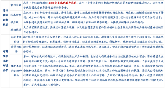 1)在第一个任期内增加4000亿美元的联邦采购,其中一个重点是购买电池和电动汽车等关键的清洁能源投入。2)未来4年内专注于清洁能源、清洁交通、清洁工业流程和清洁材料等战略研究领域。3)加强和建设美国关键的清洁能源供应链,解决对稀土矿物的依赖等问题,加快供应链弹性方面的创新。4)大力投资国家实验室、高性能计算能力设施以及其他关键基础设施。