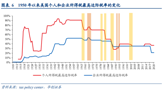 在1950年以前,美国个人所得税和企业所得税最高边际税率均呈逐渐上升趋势,这一时期,加税的主要原因是为战争筹资,在一战和二战期间,个人所得税和企业所得税最高边际税率大幅上升。从1950年代以来,美国个人所得税和企业所得税最高边际税率整体呈逐渐下降趋势,减税时期多,加税时期极少。