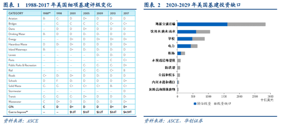 二、美国目前存在大规模基建投资缺口,如果不弥补,会对经济和社会发展造成巨大负面影响。有两个评估来源:1)美国土木工程师学会(ASCE)2021年报告认为,未来十年美国基建投资总缺口已经达到2.59万亿美元,如果不弥补,到2039年美国将损失10万亿GDP,损失2.4万亿出口。2)麦肯锡2016年的研究认为,从2017年至2030年,每年需要1500亿美元的基础设施投资,才能跟上美国经济对基础设施的需求。