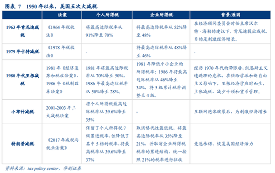 1950年以来,主要的减税有五次: 1963年肯尼迪减税、1979年卡特减税、1980年代里根减税、2001年小布什减税、2017年特朗普减税。