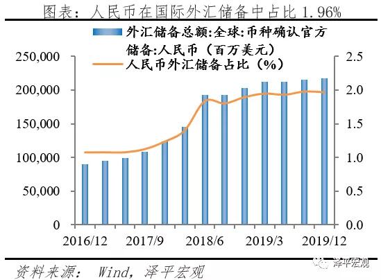 现状:人民币在国际货币体系中的地位与中国在世界经济中的地位不匹配。截至2019年,人民币全球支付份额仅1.94%,国际储备份额占比1.96%,与中国GDP占世界比重16%不匹配。