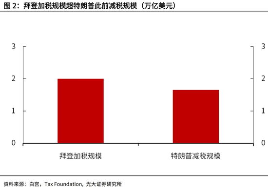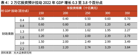假设该就业计划最终获批通过,总规模2万亿美元,时长8年,年均投资额为2500亿美元,于2022年可以落地开始实施。在1.3倍财政乘数下,可大致测算出将拉动2022年GDP增长1.62个百分点。但若拜登加税政策落地,则将冲减部分GDP增长。