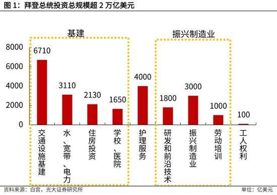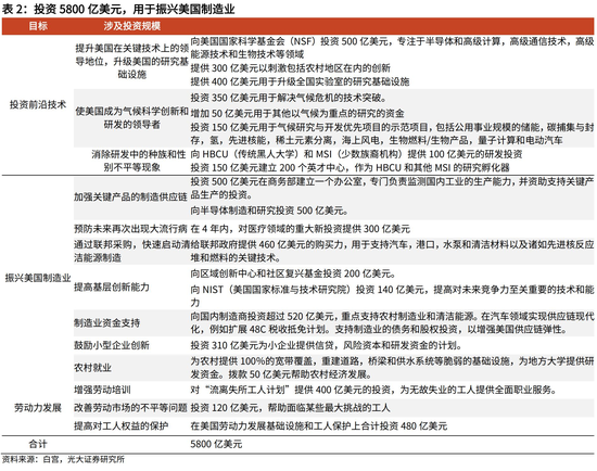 此部分包含三个部分,包括投资前沿技术(1800亿美元)、振兴制造业(3000亿美元)、为工人提供劳动培训(1000亿美元),合计投资5800亿美元。