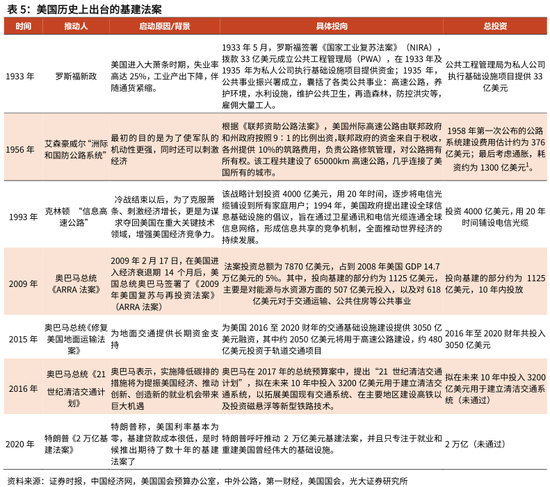 美国历次大型基建计划无非是曾经在罗斯福总统、艾森豪威尔总统、克林顿总统和奥巴马总统时期均出台过基建计划。分析这些基建计划出台的目的,无外乎有两条,第一是为了刺激经济,比如1933年推出的罗斯福新政,主要是为了通过以工代赈,降低失业率、刺激经济。第二是提高国内的基础设施条件,增强美国实力。比如1956年艾森豪威尔主导的美国公路建设,起初是为了能够增强军队的机动能力,1993年克林顿主导的电信光缆建设,则是谋求夺回美国在重大关键技术领域的竞争力。在2009年奥巴马总统推动的《ARRA法案》中,也包含了提高教育、医疗等软实力,及对交通、可再生能源等基础设施建设的支持。