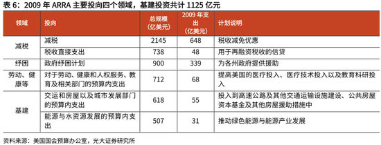 与本次拜登基建法案出台背景最为相似的,就是2009年的ARRA法案,后者的主要内容为免税、纾困、软实力提升及基建,其中基建投资约1125亿美元。ARRA计划总规模7870亿美元,通过10年逐步投放到经济系统内。其中,占比最大的部分为减税,减税和税收直接支出计划规模共计约2883亿美元,占到了总计划的1/3。第二部分是针对于各级政府的纾困计划,共计900亿美元。第三部分,是劳动、健康和人权服务、教育及相关部门的预算内支出,共计712亿美元。第四部分,主要是对能源与水资源方面的507亿美元投入,以及对618亿美元对于交通运输、公共住房等公共事业。约1125亿美元的交通、能源、公共事业的投入,加快了美国国内的电网现代化建设、能源基础设施维护保养、能源储备研究开发等进度。