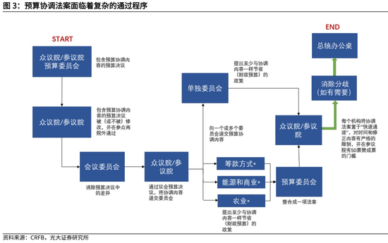对于每一种预算变更类型(直接支出、收入和债务限额),国会每个财年只有一次使用预算协调的机会。民主党2021财年已经通过了预算协调程序推动1.9万亿刺激法案时。基建计划也属于“支出”范畴,如果以“预算协调”推动基建方案,则预计可能会在2022财年(2021年10月至2022年10月)的财政支出计划中加入基建方案。预算协调面临复杂的通过计划,2020年2月5日参众议院启动1.9万亿法案的预算协调程序,在3月11日法案最终通过。