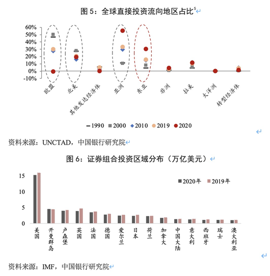 资料来源:BIS,中国银行研究院第四,亚洲新兴市场在国际资本流动中的地位进一步上升。在直接投资方面,疫情相对加速资金流向亚洲,其占比由11.2%攀升至55.4%,特别是东亚发展中经济体独占全球FDI流入量的三分之一(图5)。在证券投资方面,发达国家仍是主要投资目的地与对外投资主力军(图6),但新兴经济体投资增速较快,2020年前三季度证券投资流动规模达8万亿美元,较十年前增长188%。在银行跨境债权方面,发达经济体配置比例趋降,亚洲配置比例不断上升(图7)。国际资本流动基本形成北美、欧盟、亚洲三足鼎立格局。