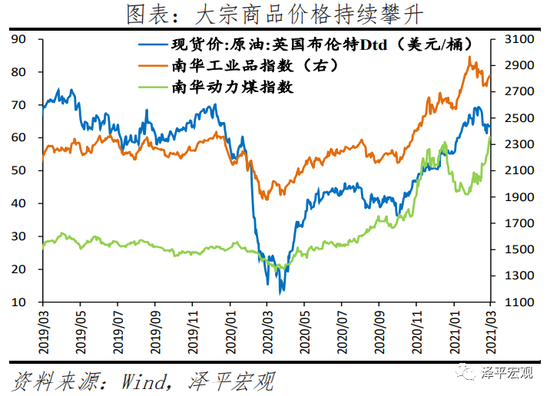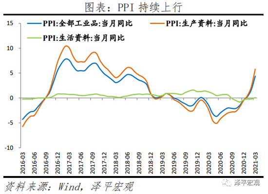 PPI上行主要受国际大宗商品价格拉动,与全球货币超发、供需缺口拉大有关。3月布伦特原油均价环比5.6%,南华工业品指数环比2.8%,南华螺纹钢环比7.6%,LME铜环比6.6%。