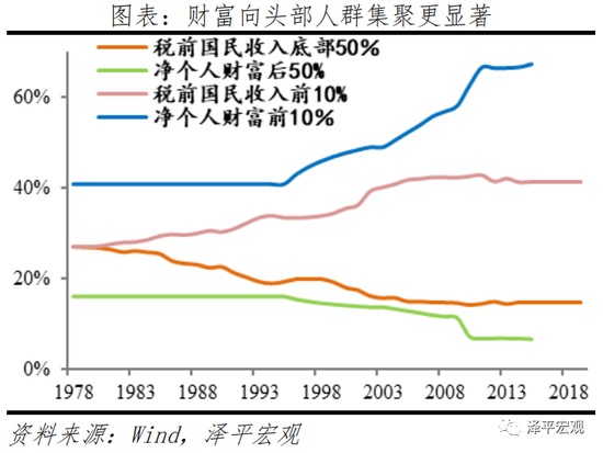 中国近十年来也出现社会财富向头部集聚、收入分配差距拉大等问题。基尼系数由2015年的0.465上升至2018年0.468,税前收入前10%的人群收入所占比重由2000年的35.56%提高至2019年的41.43%,个人财富排名前10%的人群占社会财富的比重由2000年的47.75%迅速攀升至2015年的67.41%。