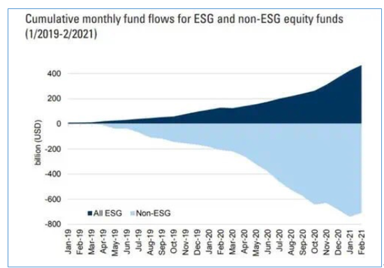 而且很显然,投资者对ESG股票(深蓝色)的需求非常强烈。截止2021年2月,全球非-ESG(non-ESG)股票基金累计流出资金7000亿美元,但ESG股票基金累计流入资金4500亿美元,因此ESG主题和投资策略是全球股票资金流入的最大驱动力之一。