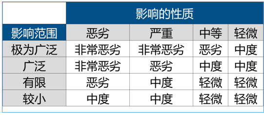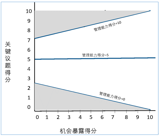 当公司面临相同程度的机遇时,具备卓越管理能力的公司将指向更高的机会项得分,采用一般管理能力的公司指向一般的机会项得分,而采取较差管理能力的公司将导致公司较低的机会项得分。机会项的评价也同样采用0-10 分的打分方法。