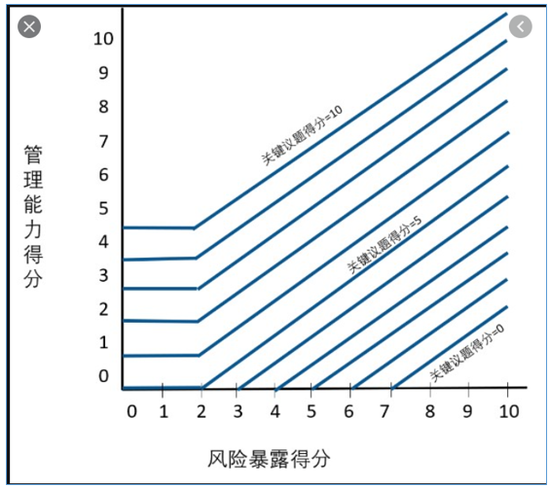 例如,当公司面临较高风险暴露(7分)及具备较差风险管理能力(0分)时,最终风险项指标得分为0分;当公司面临较低风险暴露(2 分)且具备较差风险管理能力(0分)时,最终风险项得分为5分;而当公司面临低风险暴露(2分)而具备最高风险管理能力(5分)时,最终风险项评分为满分10分。