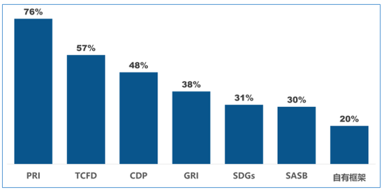 为有效发挥ESG策略的价值,这些投资者使用了不同类型的ESG框架。MSCI的调查显示,有76%的投资者使用基于联合国负责任投资原则(UN PRI)的ESG负责任投资标准。其次,有57%的投资者使用气候相关的财务披露TCFD (Task Force on Climate-related Financial Disclosures)的ESG负责任投资标准。第三,有48%的投资者使用碳排放披露数据库CDP (Carbon Disclosure Project)作为的ESG负责任投资标准。