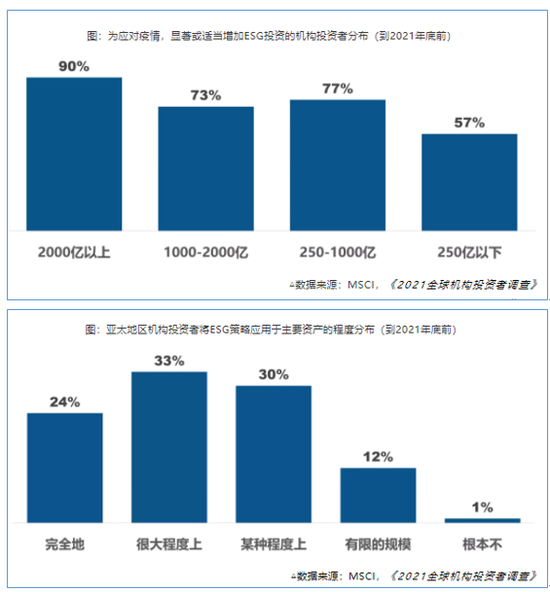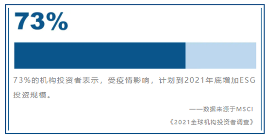 根据MSCI 《2021全球机构投资者调查》,有73%的机构投资者表示,受疫情影响,计划到2021年底增加ESG负责任投资规模。本次接受MSCI调查的机构覆盖了全球主要国家和地区,其中有66家(33%)来自亚太地区。