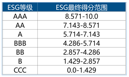 5、最终得分评级:MSCI ESG的最终评级结果与所处行业有关。根据环境和社会风险对不同行业的影响程度和影响时长,MSCI为每个GICS子行业设置了环境和社会范畴的关键问题权重;治理指标始终是重要的,会对所有公司得分进行加权和分析。