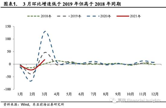 一季度中国出口实际同比增长率显著高于往年平均值,基数效应和全球经济复苏共振下,中国第一季度出口额同比增长38.7%。环比较2020年四季度下降9.58个百分点。从单月来看,3月份同比增速较1-2月有所放缓,单月同比增速回落至30.6%,略低于预期,但是相较2018年和2019年同期同比分别增加0.39个和0.22个百分点,增速依然强劲。剔除基数效应后,3月出口贸易额较2月增长17.1%,高于2018年同期,但是低于2019年。与同期其他经济体相比,韩国和巴西出口额同比增长分别为16.59%和33.17%,均较前值大幅反弹,显示出新兴市场随着经济逐渐复苏,出口开始加速修复。