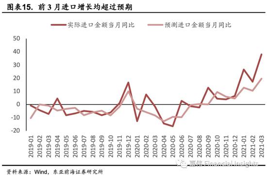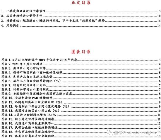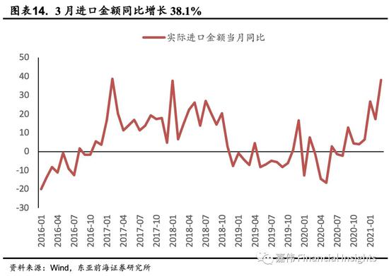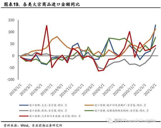 三因素推动进口量价齐升:一是国内疫情防控形势持续向好,“就地过年”倡议令复工复产比往年提前,对制造业的积极推动力较大,扩大了进口需求,从而推动了原材料需求增加,国内经济持续恢复,积极因素明显增多,推动了进口量的快速增长。二是民营企业经营情况好转。民营企业进口延续前期高增长,同比增长33%,增速远高于整体进口增速,对进口增速拉动作用明显;民营企业经营活力强,显示内需持续向好。三是大宗商品价格增长对进口总额起支撑作用。一季度进口的主要大宗商品价格较2020年四季度有明显上升,推动了我国进口金额增长。在当前形势下我国电子产业链也增加了进口需求。