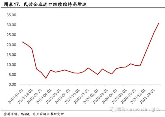 第一,国内疫情防控形势持续向好,“就地过年”倡议令复工复产比往年提前,对制造业的积极推动力较大,扩大了进口需求,从而推动了原材料需求增加,国内经济持续恢复,积极因素明显增多,推动了进口量的快速增长。第二,民营企业经营情况好转。民营企业进口延续前期高增长,同比增长33%,增速远高于整体进口增速,对进口增速拉动作用明显;民营企业经营活力强,显示内需持续向好。第三,大宗商品价格增长对进口总额起支撑作用。一季度进口的主要大宗商品价格较2020年四季度有明显上升,推动了我国进口金额增长。在当前形势下我国电子产业链也增加了进口需求。