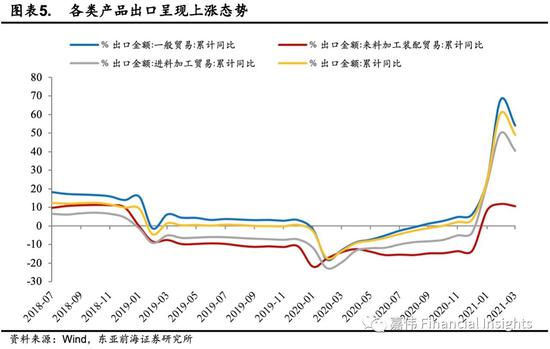 2021年第一季度中国出口金额(以美元计)累计同比增长49%。从结构来看,一般贸易出口金额涨幅较为明显,同比增速高于总出口增长率,累计同比增长54%,贸易总值占比61.2%,对出口提升贡献较大。加工贸易出口1852.34亿美元,增长38.88%,占贸易总值22.6%。其中来料加工装配贸易出口金额累计同比增长10.6%;进料加工贸易出口金额累计同比增长40.4%。3月份单月来看,出口累计同比增速为49%,比前值低11.6个百分点。一般贸易和进料加工贸易回落较大,分别比前月降低13.8%和9.5%,来料加工累计同比增速亦小幅回调。尽管三月份出口累计同比增速下降,但是相较历史同期仍然处于较高水平。