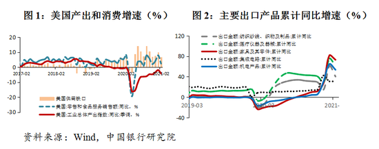 第一,海外经济复苏加快带动我国出口增长。3月,我国出口2411.3亿美元,同比增长30.6%,两年平均增长10.2%。中国对美国、欧盟、日本出口分别累计同比增长74.7%、56.7%、30.6%,两年平均增速分别为10.2%、5.1%和3%。出口保持较高增速,除了受低基数影响外,主要得益于海外经济复苏较快、外需回暖强劲。3月,美国、欧元区、日本的制造业PMI分别为64.7%、62.5%和52.7%,环比分别上升3.9、4.6和1.3个百分点。海外生产恢复较快,但部分发达国家仍存在供需缺口,替代效应对出口仍有支撑。例如美国2月工业总体产出指数同比负增长4.2%,而零售和食品服务销售同比增长6.6%(图1)。