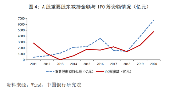 部分研究表明,一般法人中包含大股东、创始人、高管在内的产业资本对于股市的影响较为显著。当其对股票市场或上市企业的信心减弱时,减持潮便会出现,对市场形成压制。此外,部分创始人股东处于自身利益的考虑,在市场出现局部高点时,减持行为也容易出现。数据显示,2020年全年,A股市场重要股东减持金额达到6660亿元,高出IPO融资规模51.8%(图4)。减持潮的出现是导致我国股市无法充分反映经济发展情况,股市投资者盈利不足,牛短熊长的重要原因之一。
