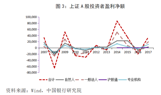 理论上来看,机构投资者具有更强的信息获取与分析能力,机构投资者的长期投资在维持市场稳定、快速形成均衡价格、改善公司治理结构等方面能够起到积极的作用。因此,既要进一步规范机构投资者行为,又要提高机构投资者规模。当前,我国机构投资者占比较低对股市的发展带来了一些负面因素。一是规模较低导致机构投资者难以提高定价效率,股票难以合理定价。由于市场上短期交易行为较多,大股东减持规模较大,再加上房地产市场繁荣的影响,我国股市无法保障充裕的流动性,“赚钱效应”不足。机构投资者规模的不足导致其难以应对这些负面冲击,盈利能力较低。当前,我国专业投资者盈利能力并未显著高于自然人。数据显示,2007-2017年11年间,上证A股投资者中专业机构投资者盈利高于个人投资者的年份仅有5年,且显著低于一般法人(图3)。这导致机构投资者难以发挥提高股票定价效率的作用,上市企业股价与其基本面不匹配现象较为普遍。股票定价的不合理导致上市公司估值不准确,上市公司优劣难以准确区分,不利于绩优企业的上市融资。