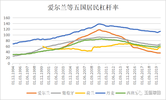 2. 居民去杠杆幅度最大的五个国家:爱尔兰、葡萄牙、荷兰、丹麦、西班牙。2020年9月末和2015年末相比,分别下降20.3、9.9、9、6.9、6.8个百分点。爱尔兰的居民杠杆率变化幅度最惊人,从2002年3月末的50.7%升至2009年底的117.4%,然后房地产泡沫破灭,经历了严重的债务危机,居民去杠杆的过程到现在还没结束,2020年9月末是35.5%。