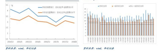 左面板:上市银行资本充足率高于监管要求部分逐渐缩减;右面板:多家商业银行各级资本充足率濒临监管要求(2018Q3)