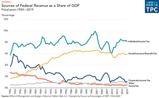 只要简单看一下数据就会发现,从里根,老布什,克林顿(将最高边际税率从老布什时代的31%上升到39.6%),小布什,到奥巴马和特朗普,个人所得税率的增减与个人所得税在政府税收或GDP的占比增减,都有着明显的对应关系。