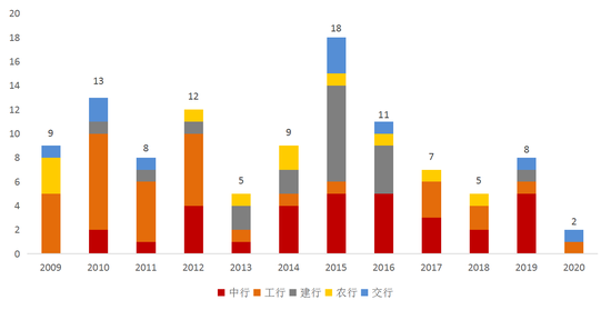 1.境外布局扩张速度明显放缓。2020年,五大行新开业的机构分别是工商银行奥克兰分行、巴拿马分行,中国银行(秘鲁)有限公司,建设银行欧洲匈牙利分行和交通银行南非约翰内斯堡分行,合计共5家,数量较上年减少了3家。从覆盖的国家和地区数量来看,仅工商银行、交通银行有所增加,分别是在巴拿马和南非。2009-2019年,五大行境外机构辐射范围明显扩大,平均每年每家银行都会延伸到2个新的国家和地区。最高峰为2015年,建行、中行、交行、工行和农行的机构辐射范围分别新增了8、5、3、1和1个国家或地区(图1)。 2020年五大行新覆盖的国家和地区的数量为近十年来最低值。