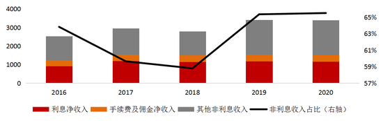 3.收入结构不断丰富多元。受全球低利率环境影响,五大行境外利息收入空间持续收窄,营收贡献度连续两年下降。2020年五大行境外机构利息净收入合计1169亿元人民币,同比下降0.96%,占境外营收总额的34.5%,占比较上年同期下降0.2个百分点(图4)。境外非利息收入中,手续费及佣金收入合计规模为356亿元人民币,同比下降1.15%;其他非利息收入(如投资收益、汇兑收益等)合计规模为1863亿元人民币,同比下降0.11%,降幅明显低于传统利息收入和手续费及佣金收入。