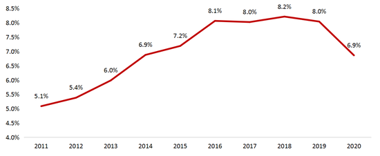 1.整体集团贡献度明显下降,主要受盈利下滑拖累。2020年,五大行境外资产规模的集团贡献度由11.6%降至10.5%,建行降幅最大,为1.7个百分点;境外税前利润的平均集团贡献度由9.5%下降至7.0%;境外员工人数的集团贡献度由3.0%上升至3.1%,其中中行、交行分别提升了0.1个百分点。以资产规模、税前利润和员工人数等三方面的平均集团贡献度作为国际化水平的衡量指标来看,五大行国际化水平已连续两年出现下降(图3)。其中,境外机构盈利明显下滑是国际化水平下降的主要驱动因素。2020年五大行境外机构营业收入规模合计3387亿元,同比下降0.5%,为近十年来第二次负增长;税前利润合计926亿元,同比下降26%。相比而言,五大行集团层面的营收和税前利润均实现平稳增长,使得境外机构盈利贡献度明显下滑。