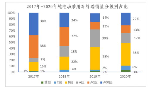 从我国纯电动乘用车的终端销量看,小型电动车是重要的市场。数据显示,五菱宏光、长城黑猫等新款小型电动车的旺销,2020年,我国小型电动汽车(A00级、A0级车销量)达33.6万辆,比2019年增长46.7%,在销售终端的占比达到35%,较2019年提高了8个百分点。