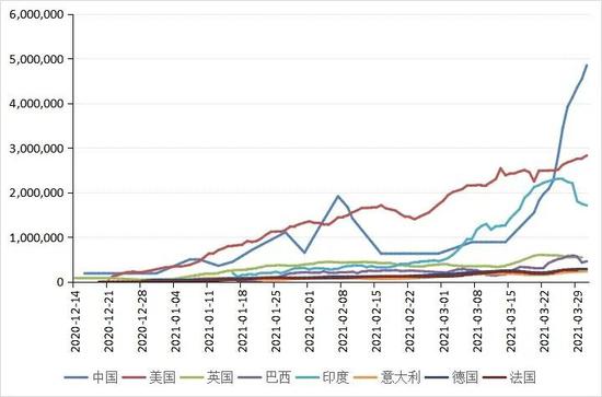 在疫情和疫苗的赛跑中,疫苗占了上风,2021年疫苗注射快的国家与疫苗注射慢的国家,经济表现的差距可能拉大。先从疫情发展来看,2021年,美国新增疫情人数有所趋缓,但部分州的疫情仍较为严重。西班牙、德国、法国等欧洲部分国家的新增疫情人数仍在上升。阿根廷、巴西、印度和土耳其等新兴市场国家的疫情继续恶化。从疫苗每日新增接种剂数来看,相较其他国家,美国的疫苗接种推进速度相对较快(见图2)。