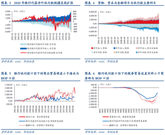 银行代客涉外收付款在变动趋势上和国际收支平衡表(BOP表)有较强的相关性。贸易与投资形成的外汇流动会直接计入国际收支平衡表中(因此商品贸易与服务贸易顺差与BOP表经常账户差额规模基本一致),而其中涉及到银行收付款的部分会计入银行代客涉外收付款;根据外管局的解释,银行代客涉外收付款是国际收支统计的组成部分,反映了境内非银行部门通过境内银行与非居民之间发生的涉外收入和支出的规模,但不能反映实物交易和银行自身的涉外交易,因此统计范围小于国际收支统计。另外国际收支平衡表与银行代客收付款的记账方式不同,BOP表采用权责发生制,银行收付款采用资金收付制,因此二者间存在一定的差异。由于BOP表较全面的记录了所有的跨境资本流动,而银行代客收付款统计口径较BOP表更小,因此通常小于BOP表数据,但趋势存在较强的相关性。